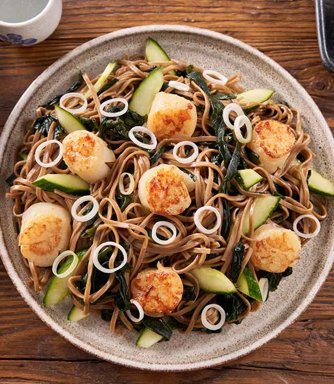 Juicy, golden-grilled scallops served on soba noodles with crunchy cucumber and wakame seaweed. A light and elegant fusion dish seasoned with Kikkoman Poke Sauce.