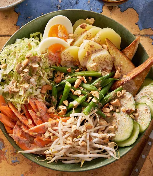 Gado-gado salad from Indonesia, drizzled with aromatic Kikkoman Sesame Sauce. Nuts add crunch and distinctive character.