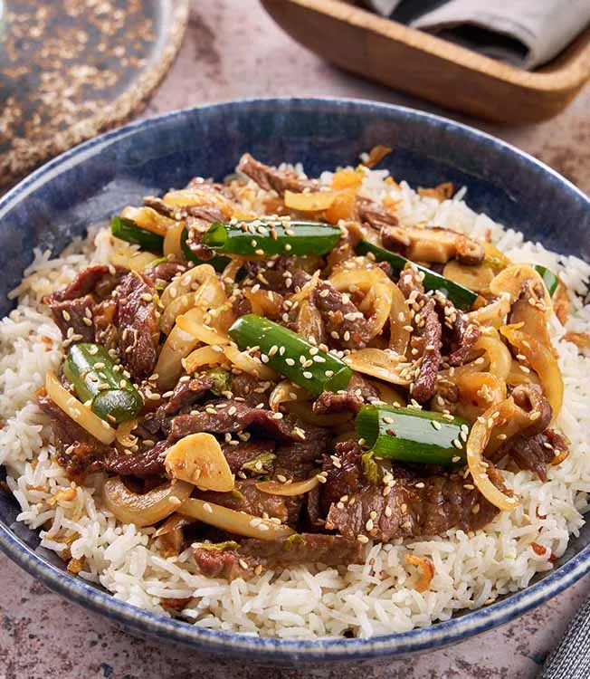 Tender beef stir-fried with shiitake mushrooms and kimchi in Kikkoman Gluten free Soy Sauce. Juicy meat and a deep umami flavour are enhanced by toasted sesame and spring onions, creating a rich and satisfying dish.