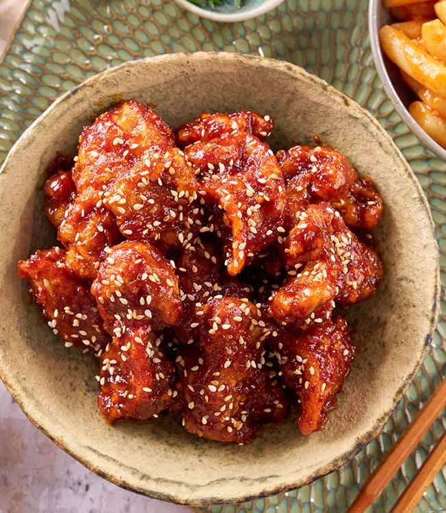 Juicy chicken, double-fried for exceptional crispiness and coated in a sweet-spicy Kikkoman Kimchi Chili Sauce with honey and garlic—authentic Korean street food at its best.