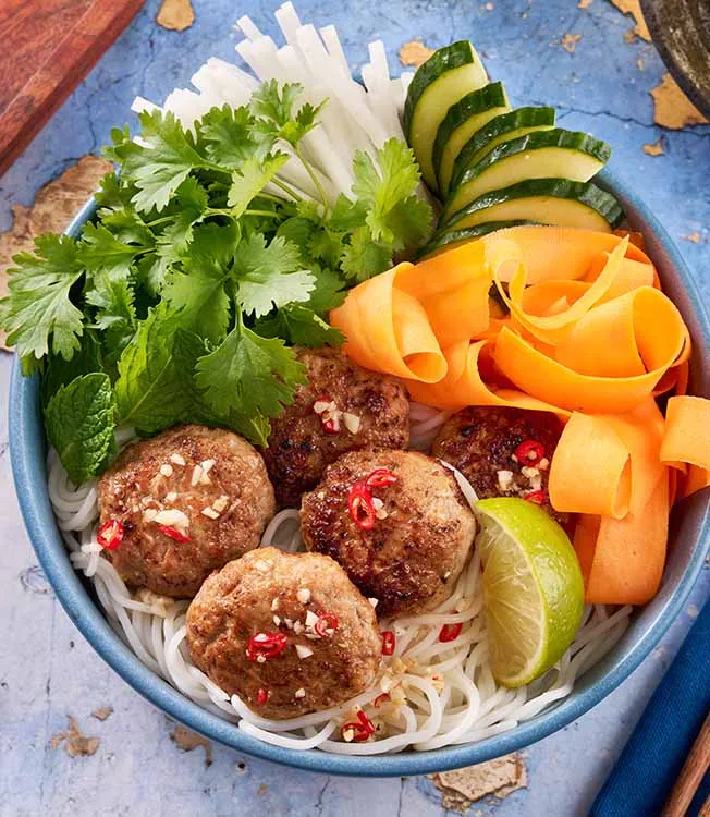 In a bowl, place a portion of rice noodles. Add the carrot, cucumber and daikon. Top with the meatballs and drizzle with the sauce. Garnish with the herbs, lime wedges and optional chilli.