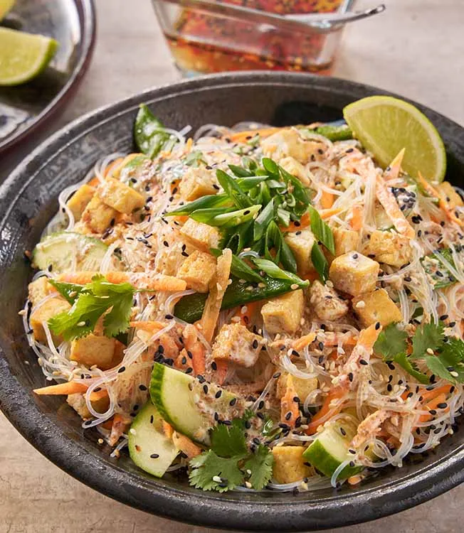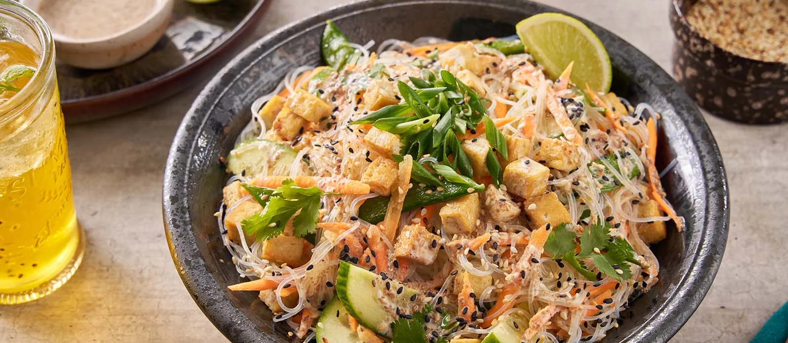 A light and aromatic rice noodle dish with smoked tofu, crunchy vegetables and Kikkoman Sesame Sauce, full of contrasting flavours and textures.