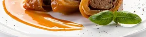 A vegetable of minced meat stuffed dumpling with a thickish wrapper which are part-steamed and part pan-fried until crispy on the outside.