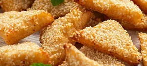 Minced prawns coated with sesame seeds spread on dainty triangles bread which is then deep-fried.