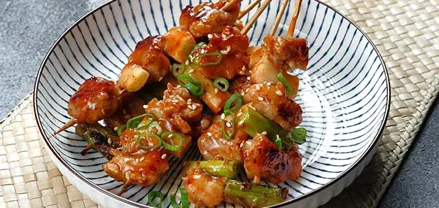 Along with edamame, fried seafood, salads, sushi and hot pots, you’ll often find Japanese grilled chicken skewers called Yakitori on the menu. These are always served with salt or a sweet, thickened sauce called tare. This classic, authentic recipe for Negima Yakitori (chicken thigh and spring onion skewers) is hard to beat.