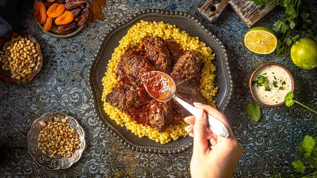 Fragrant beef kofta recipe spiced with cinnamon, cumin and fresh herbs, simmered in a tangy tomato sauce with lime. Served with couscous, yoghurt and pine nuts, it's a warming dish full of Middle Eastern character.