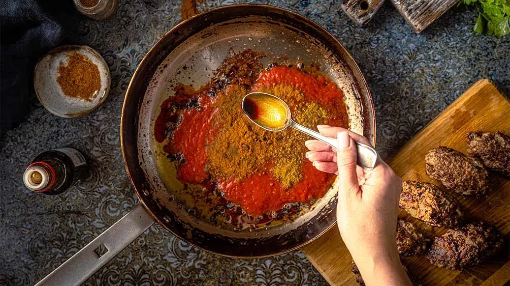 Remove the patties from the pan. Add the passata to the pan with the cooking juices. Stir in the cinnamon, cumin, chilli powder and Kikkoman Soy Sauce. Cover and simmer for about 15 minutes.