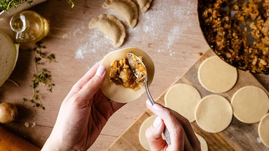 Divide the dough into three portions. Take one portion and roll it out into a thin sheet, keeping the remaining two portions covered so they do not dry out. Cut out circles from the dough. Place a teaspoon of filling in the centre of each circle, fold into a half-moon and press the edges to seal. Set the dumplings aside on a floured board and cover with a cloth. Repeat with the remaining portions. The amount of dough should make about 15–20 dumplings. Cook the dumplings in batches in boiling salted water.