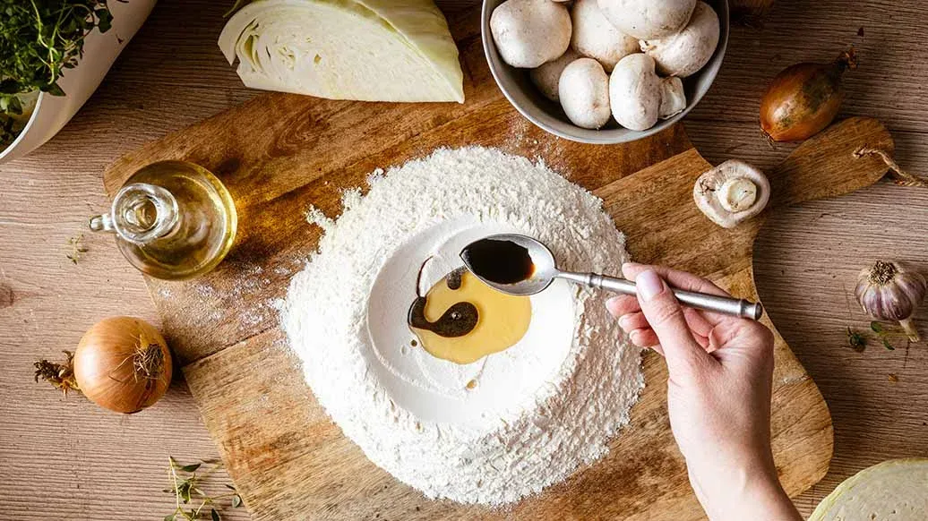 Pour the flour onto a work surface and make a well in the centre. Add the oil, Kikkoman Soy Sauce and hot water. Mix and knead until the dough is smooth and elastic. Cover the dough with a bowl and leave to rest for about 20 minutes.