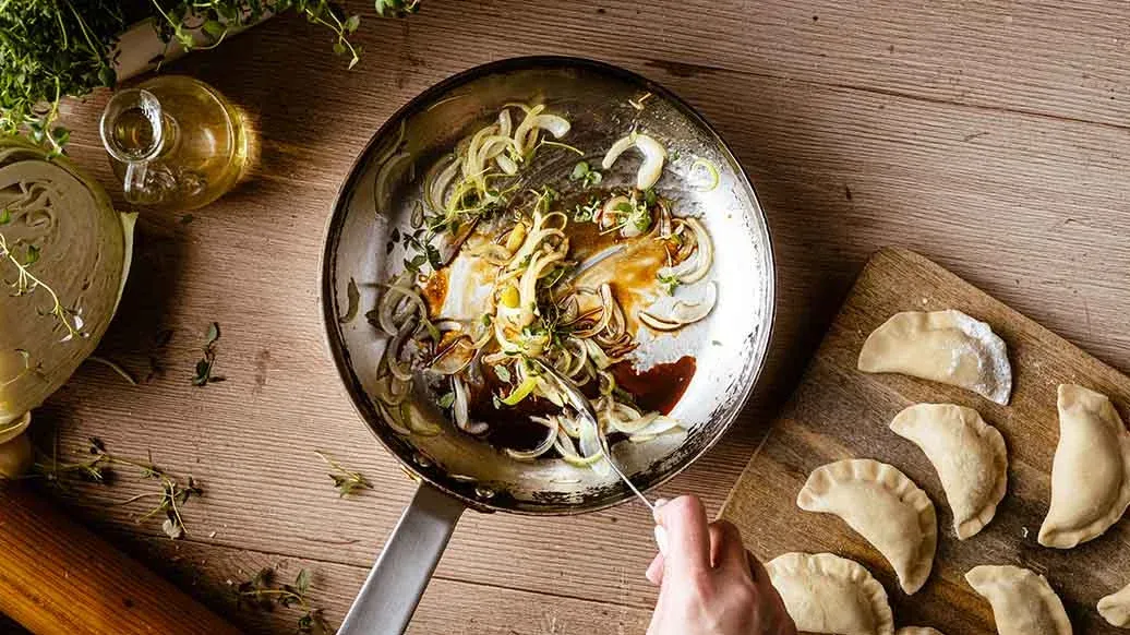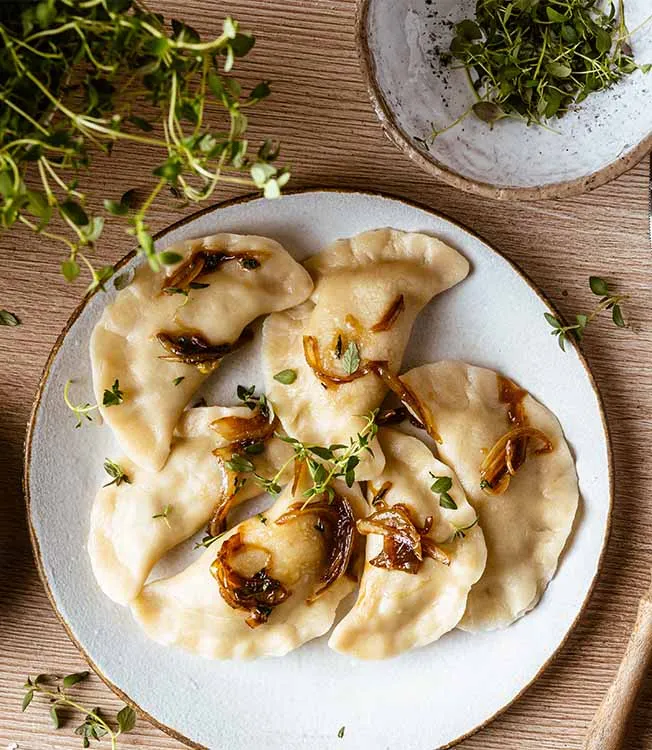 Slice the onion into thin wedges and sauté in the oil. Add the honey, Kikkoman Soy Sauce and half of the thyme leaves. Serve the dumplings topped with the caramelised onion and sprinkled with the remaining thyme leaves.