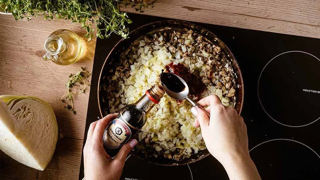 250 g white cabbage – 500 ml water – 2 onions – 1 garlic clove – 250 g button mushrooms – 20 ml vegetable oil – 2 tbsp Kikkoman Spicy Chili Sauce for Kimchi – 1 tbsp Kikkoman Naturally Brewed Soy Sauce – 1 tsp freshly ground pepper