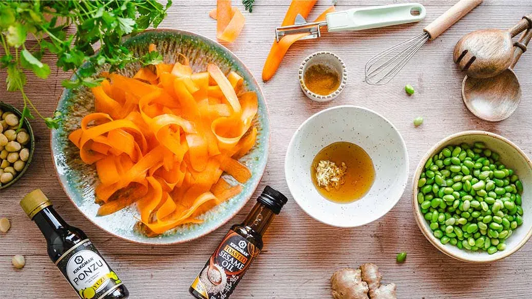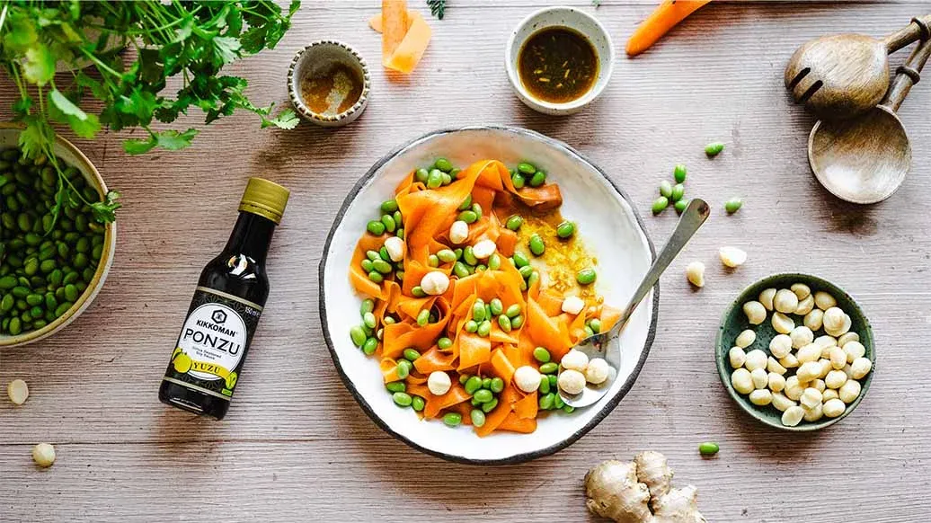 This raw carrot and ginger salad bursts with freshness, flavour and crunch. Kikkoman Yuzu Ponzu adds a citrus note, while macadamia nuts and edamame bring texture and nutritional value. Perfect as a light snack or a side for Asian-style meals. Suitable for vegans.