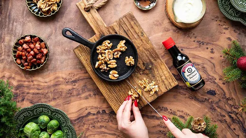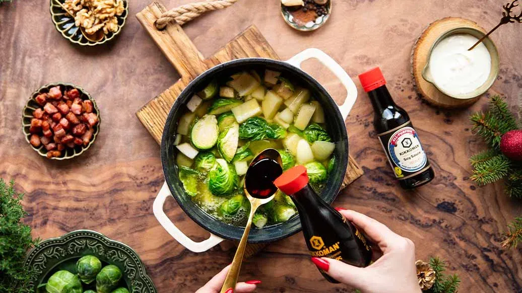 A smooth, warming blend of Brussels sprouts and potatoes with smoky bacon and a dash of Kikkoman Soy Sauce for extra depth. Topped with crunchy walnuts and a swirl of crème fraîche for a festive, elegant starter.