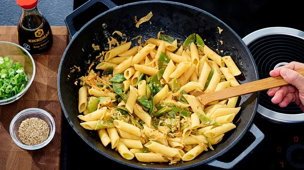 This easy fusion recipe combines fermented kimchi with creamy pasta. Thanks to the gochujang paste, peanut butter and umami-rich Kikkoman Soy Sauce, this pasta dish impresses with its spicy-sweet and nutty taste.