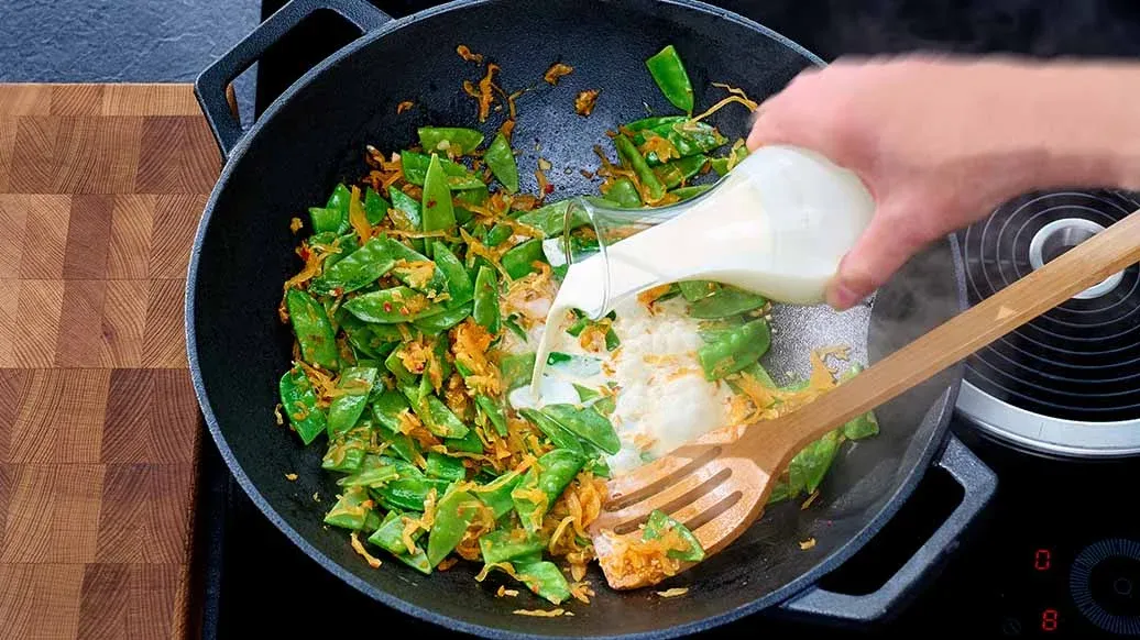 Finely chop the garlic and fry it in Kikkoman Sesame Oil in a large wok or frying pan. Add the kimchi and sugar snap peas (halve them if necessary) and fry briefly. Pour in the cream, bring to the boil and simmer for about 5 minutes.