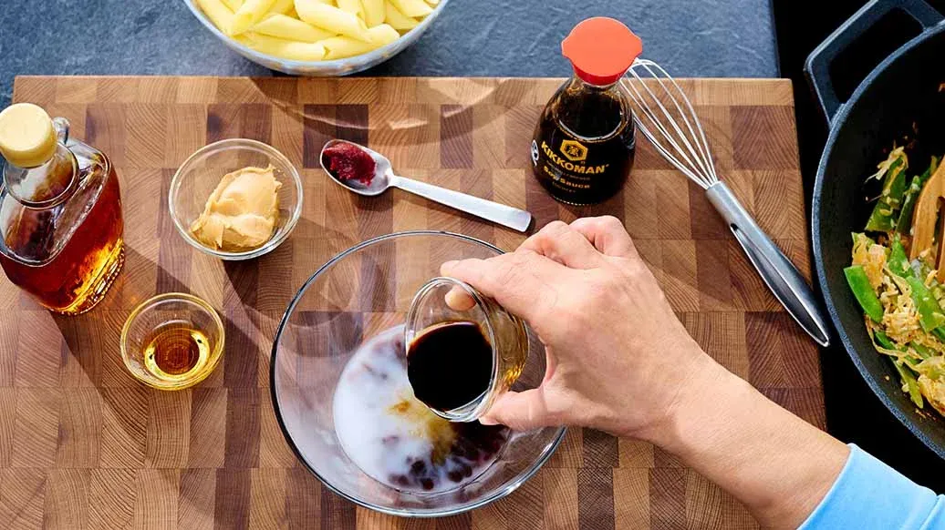 Cook the pasta according to the packet instructions and reserve about 100 ml of the cooking water when draining. Mix the cooking water with the gochujang paste, peanut butter, maple syrup and Kikkoman Soy Sauce.