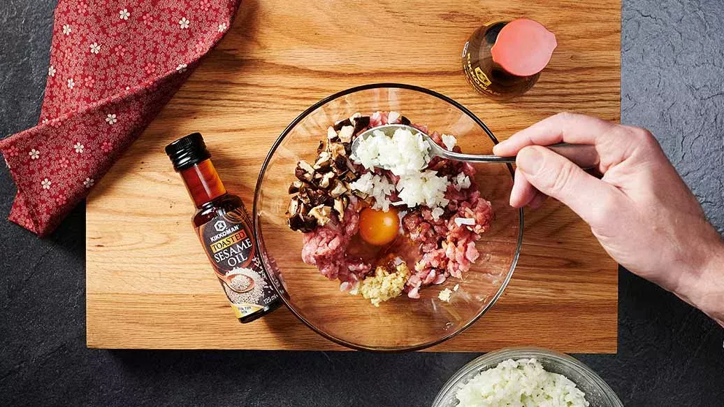 To make the filling, peel and chop the onions. Cut the stems off the shiitake mushrooms before coarsely chopping the mushrooms. Peel and grate the ginger. Dab the meat dry, cut it into small pieces and spread it out on a chopping board. Use the back of a kitchen knife to “crush” the meat.