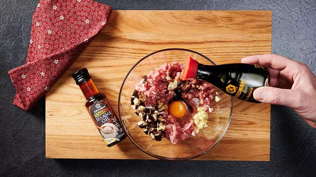 Place the “crushed” meat in a large bowl. Add the shiitake mushrooms, ginger, sugar, meat stock, soy sauce, egg, sesame oil and sake and mix thoroughly by hand.