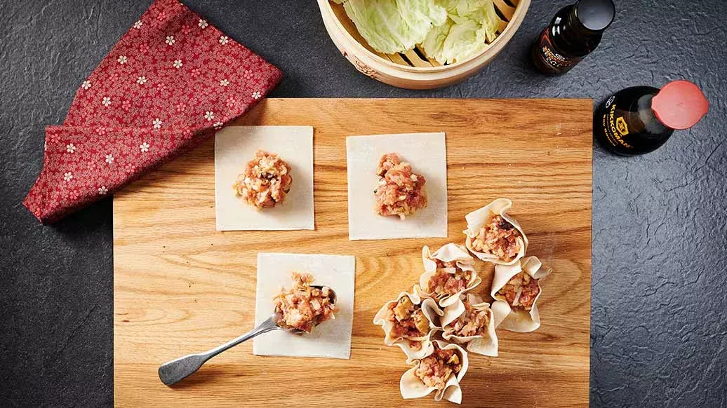Lay the siu mai skins on the worktop and spoon approx. 30 g of meat filling onto each skin. Bring up the sides of each skin so that it looks like a flower. Flatten the base of each siu mai so that it can stand up.