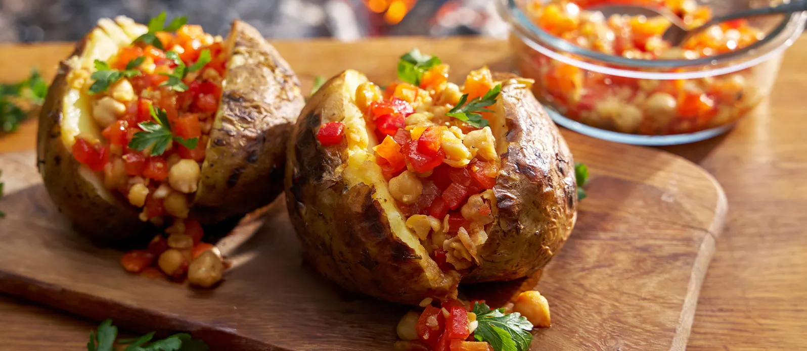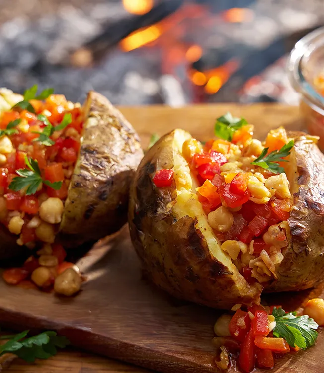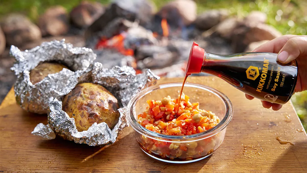 Ember-baked potato with a subtle smoky aroma, topped with a salsa of roasted red pepper, garlic and chickpeas, rounded off with Kikkoman Soy Sauce. Perfect campfire food!