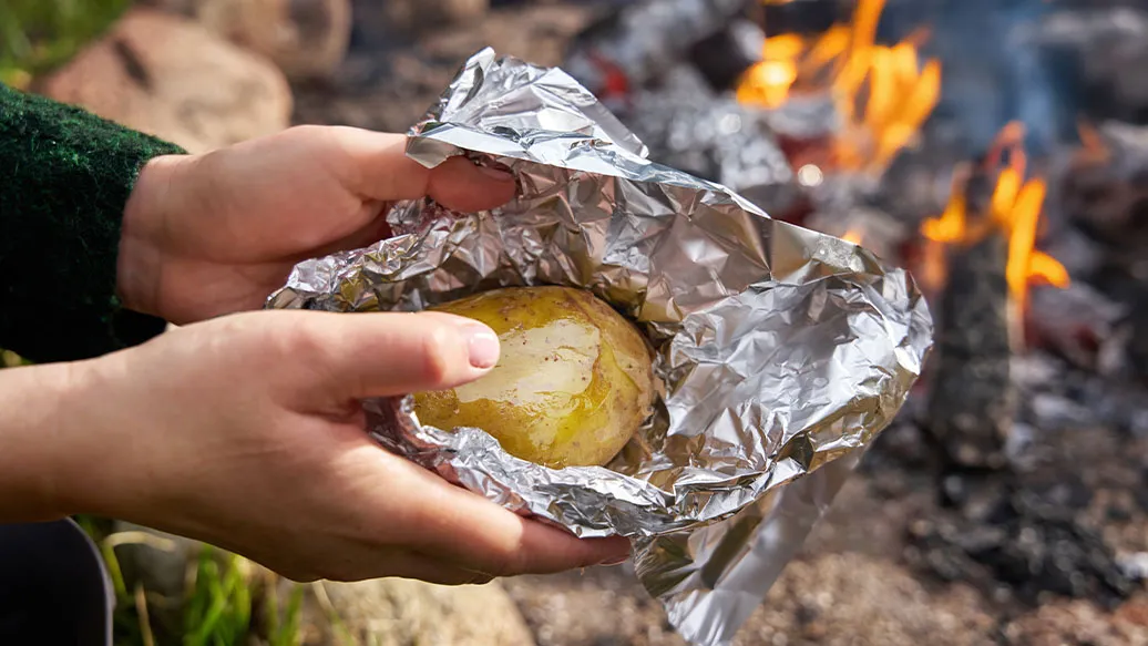Drizzle the potatoes with the rapeseed oil, wrap in foil and bury in the campfire embers for about 40 minutes.