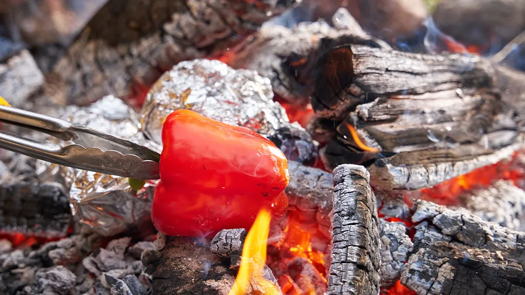 Roast the peppers over the fire, then place in a bowl, cover tightly and leave for 10 minutes before peeling off the skin.