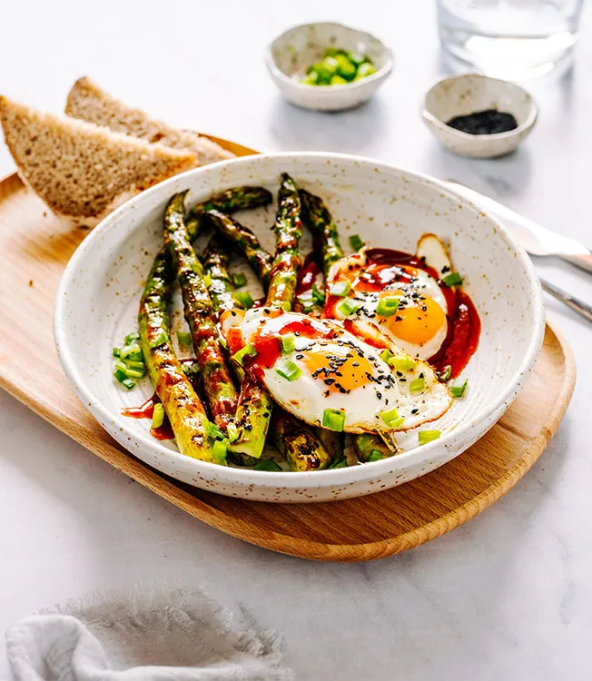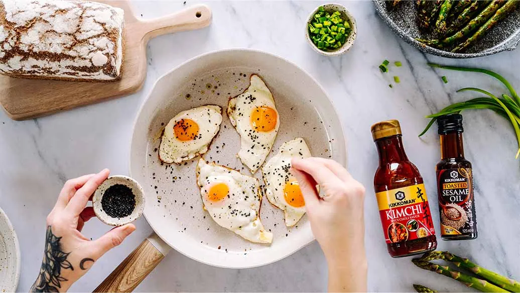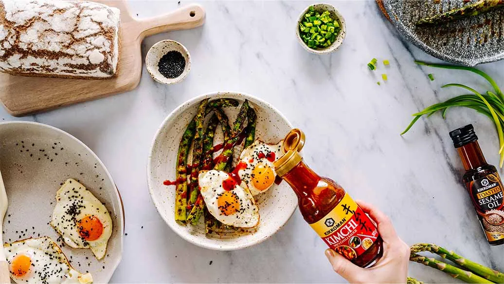Fried eggs with crunchy sesame, served on spicy grilled asparagus with Kikkoman Kimchi Chili Sauce. Simple, seasonal flavours for spring with a bold kick—satisfying and energising.