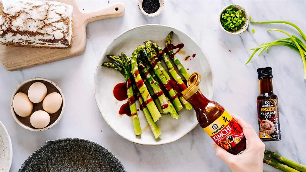 1 bunch of green asparagus – 1 tbsp Kikkoman Toasted Sesame Oil – 2 tbsp Kikkoman Spicy Chili Sauce for Kimchi