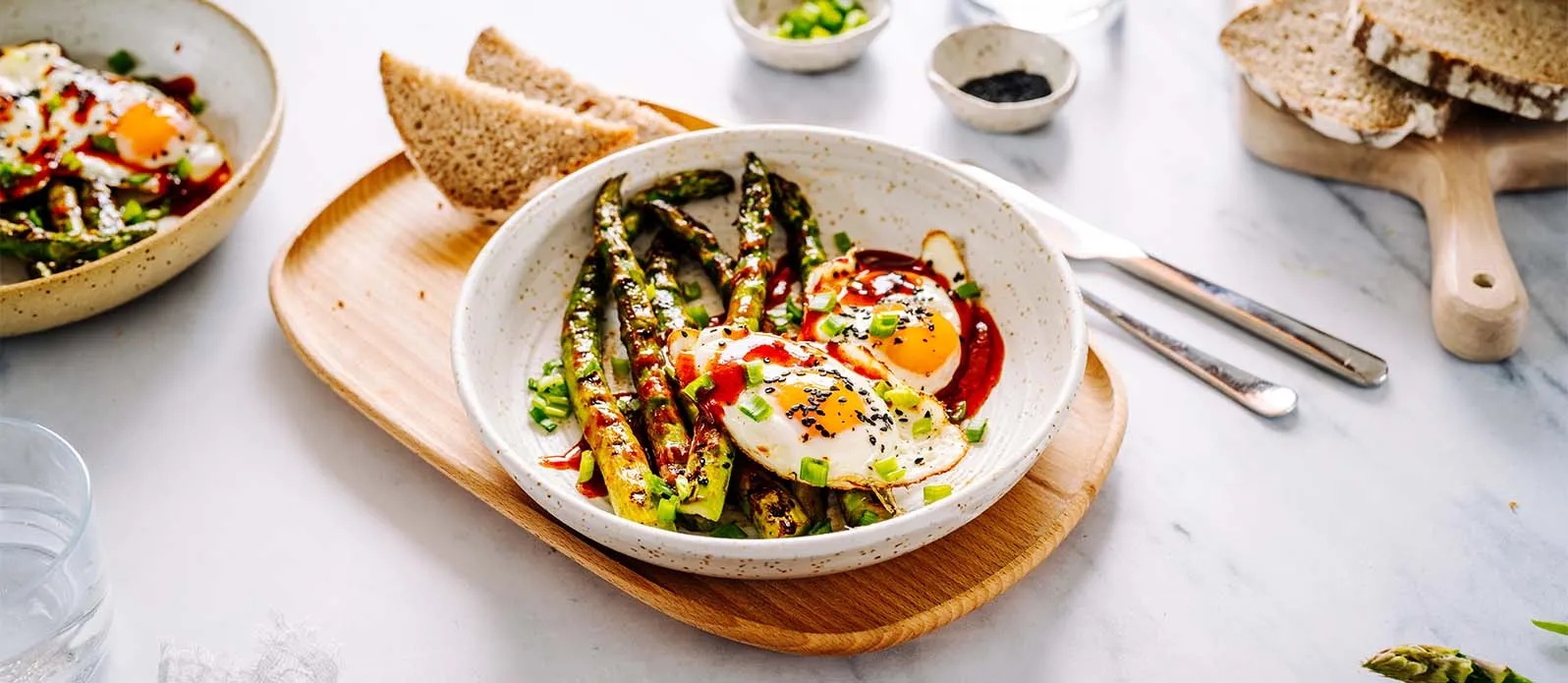 Place the eggs on the grilled asparagus. Drizzle with the Kikkoman Kimchi Chili Sauce, sprinkle with the chopped chives and serve with the sourdough bread.