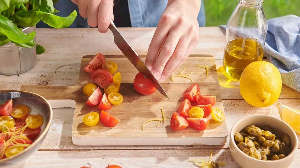 100 g cherry tomatoes – 50 g capers – ½ tsp grated lemon zest – 2 tbsp olive oil – A few leaves of fresh basil