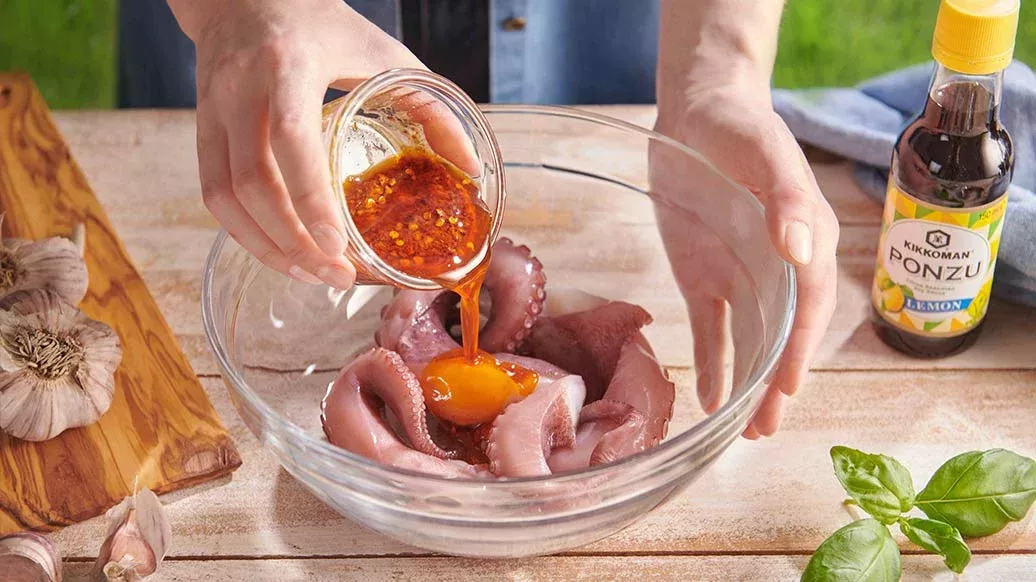 Mix the Kikkoman Ponzu Lemon in a bowl with the crushed garlic, sweet paprika, olive oil and chilli. Add the octopus tentacles and marinate in the refrigerator for 1 hour.