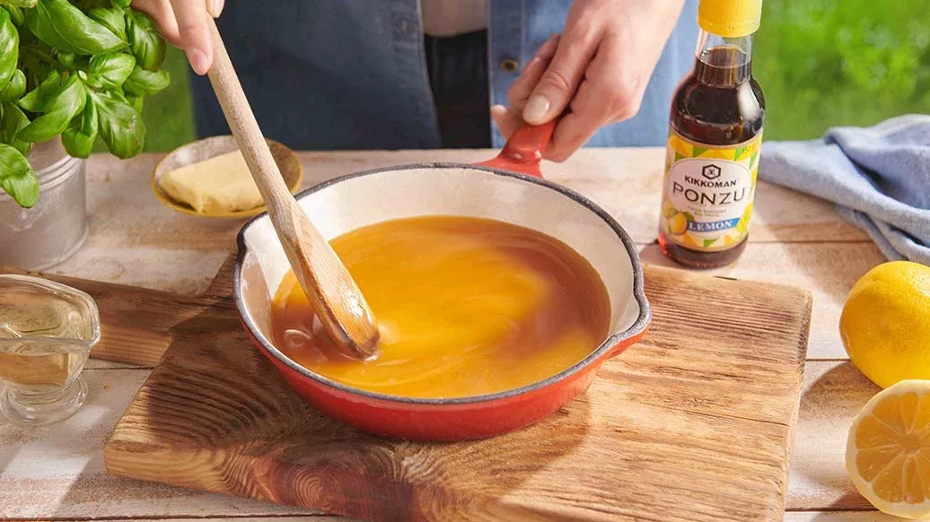 Bring the sake, Kikkoman Ponzu Lemon and lemon juice to the boil in a pan (approx. 1 min). Add the butter and remove from the heat. Stir until the butter melts and a smooth sauce forms.