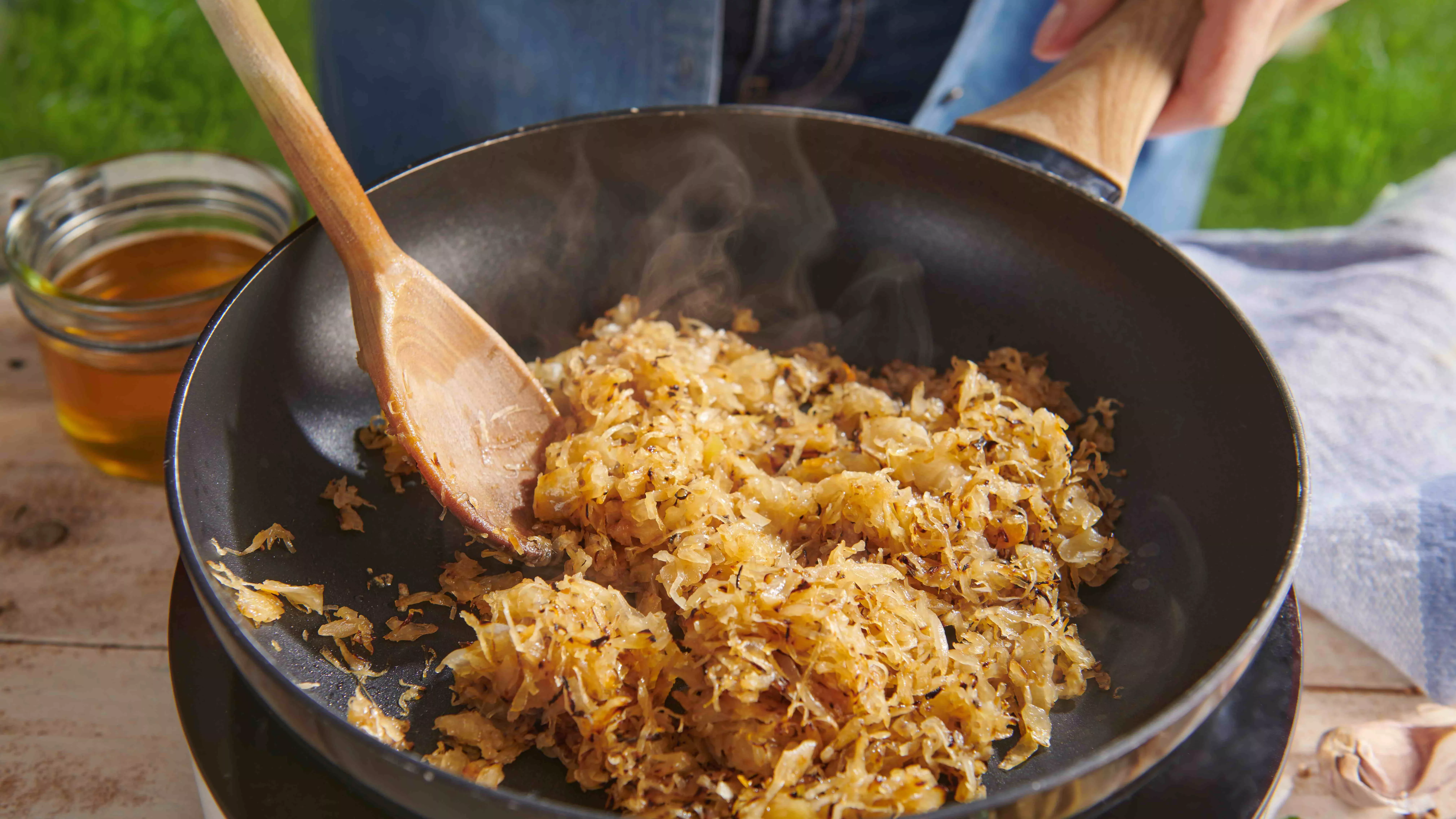 Serve the slices of meat with the fried sauerkraut and sliced gherkin on bread spread with mustard.