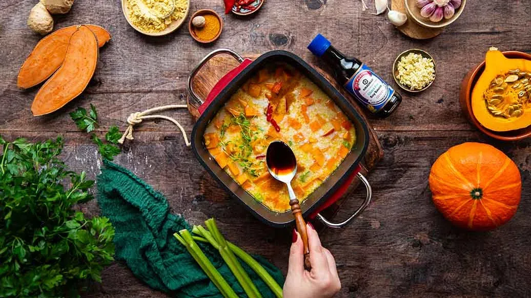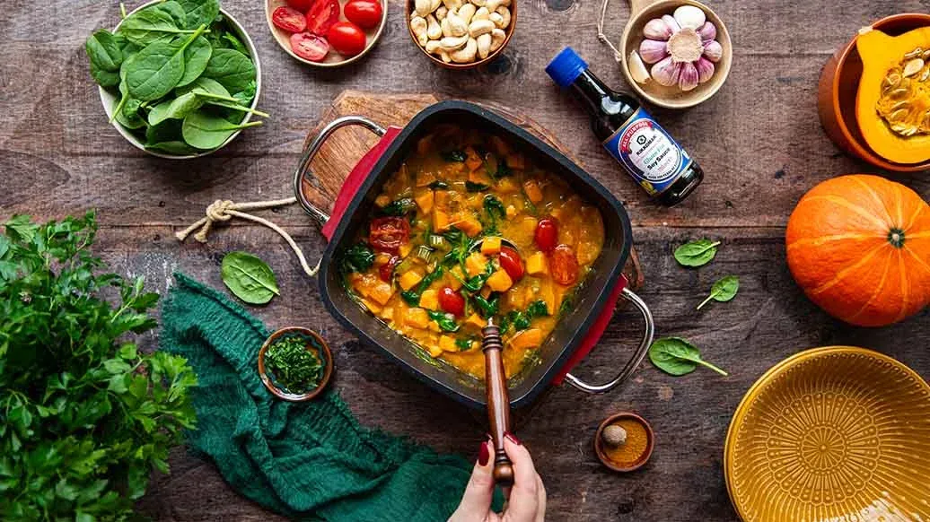 Heat the oil and butter in a saucepan. Add the vegetables from Step 1 and stir-fry briefly. Add the thyme sprigs and cornflour, stirring continuously. Pour in the stock, coconut milk and Kikkoman Gluten free Soy Sauce, then add the spices. Simmer on a low heat for 15 minutes until the vegetables are almost soft.
