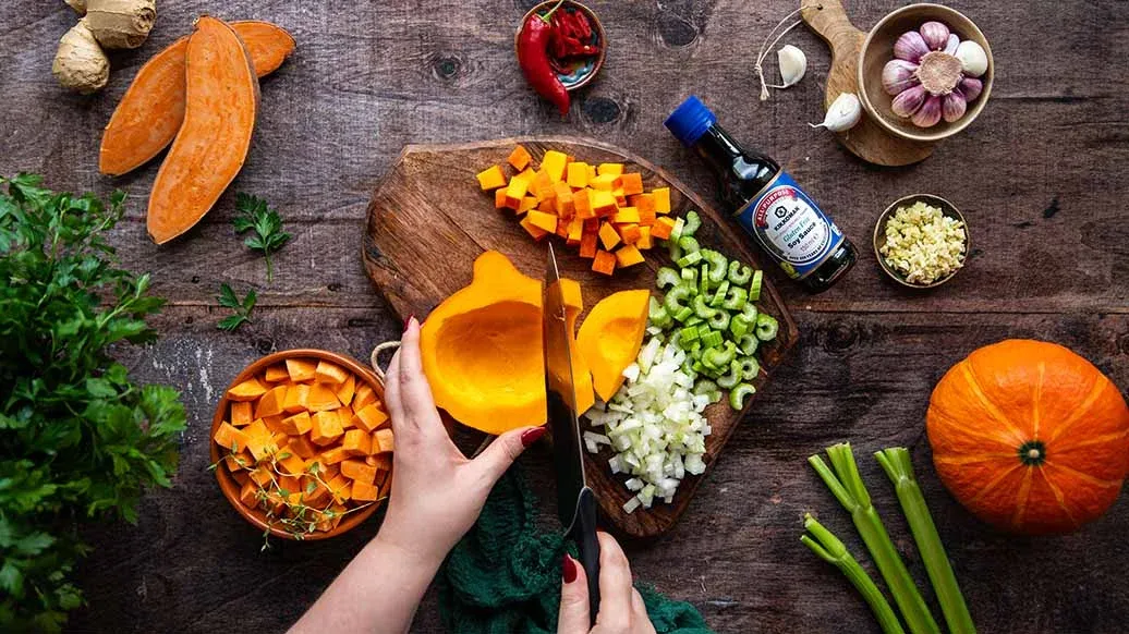 This chowder made with squash and sweet potato is a hearty and warming meal, perfect for chilly autumn and winter months. Aromatic spices and herbs give it character, while the addition of coconut milk pairs perfectly with the autumnal vegetables.
