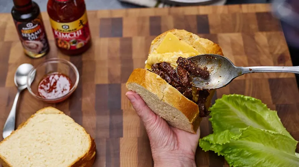 This trend for Korean cuisine continues! This sandwich makes a satisfying meal at any time of day. It brings together fluffy scrambled egg, light and sweet brioche, juicy beef, and tangy cheese—all with just a hint of spiciness.