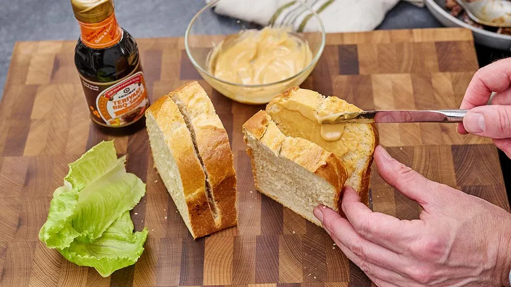To make the sauce, mix the mayonnaise with 1 tbsp Kikkoman Teriyaki BBQ-Sauce Honey. Slice the brioche or bread almost all the way through and thinly spread approx. two-thirds of the sauce on the inside. Wash and pat dry the lettuce.