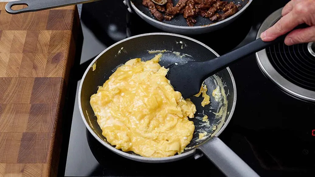Beat the eggs with the cottage cheese, brown sugar and 1 tbsp Kikkoman Teriyaki BBQ-Sauce Honey until light and frothy. Season with the pepper and fry in hot oil in a small non-stick pan until fluffy.