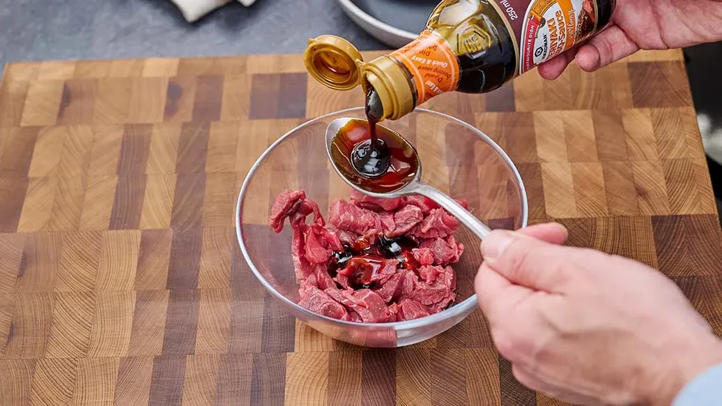 200 g beef fillet – 3 tbsp Kikkoman Teriyaki BBQ-Sauce with Honey – 1 tbsp roasted sesame seeds – 1 tbsp vegetable oil