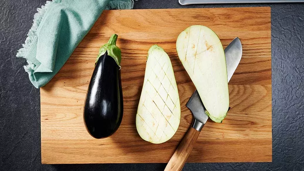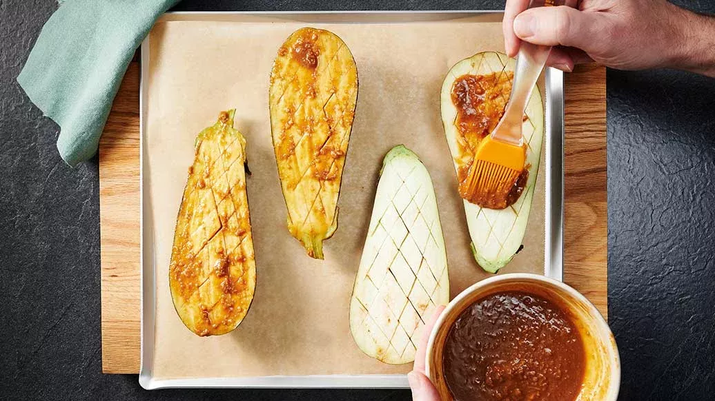 Preheat the oven to 180°C. Slice the aubergines in half lengthways and score the flesh in a diamond pattern, taking care not to cut through the skin. Line a baking sheet with greaseproof paper and lay the aubergines on top, cut sides up.