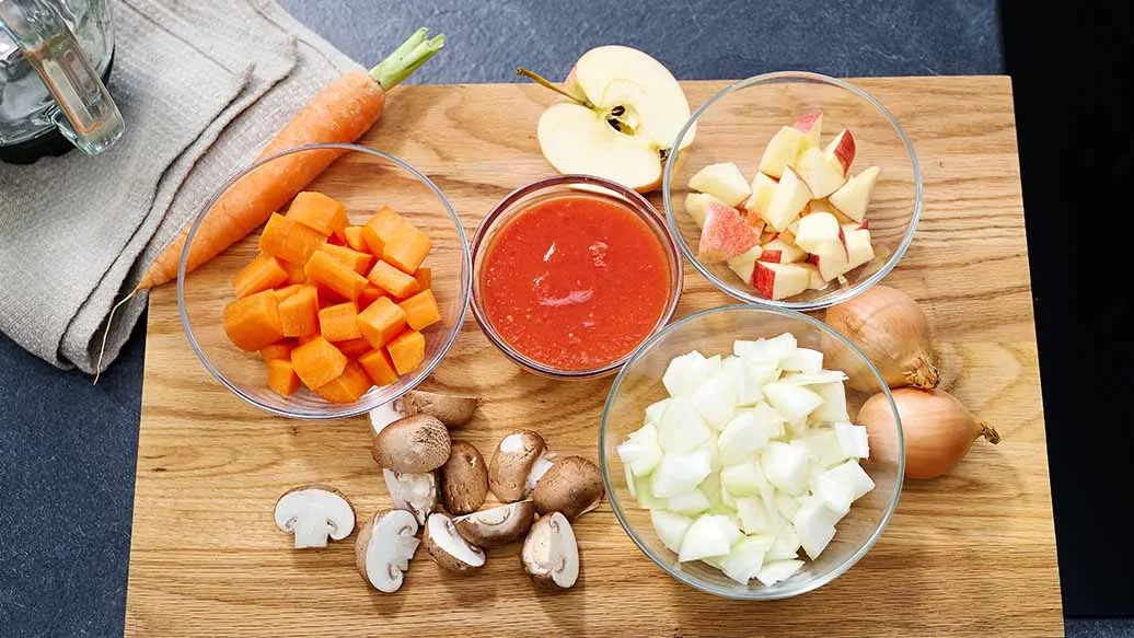 200 g onion – 150 g carrot – 6 mushrooms – ½ apple – 150 g tinned tomatoes