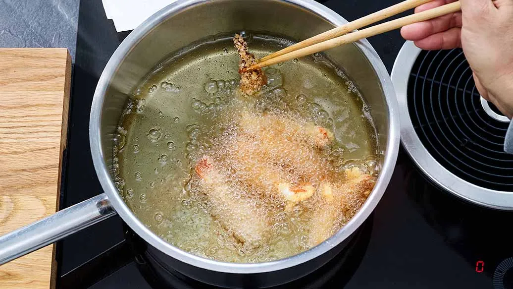 80 g cabbage (green or red) – 6 g whole raw king prawns – 1 pinch of salt – 1 pinch of pepper – 2 tbsp flour – 1 egg – 30 g Kikkoman Panko - Japanese style crispy bread crumbs – 500 ml oil for deep-frying in a saucepan