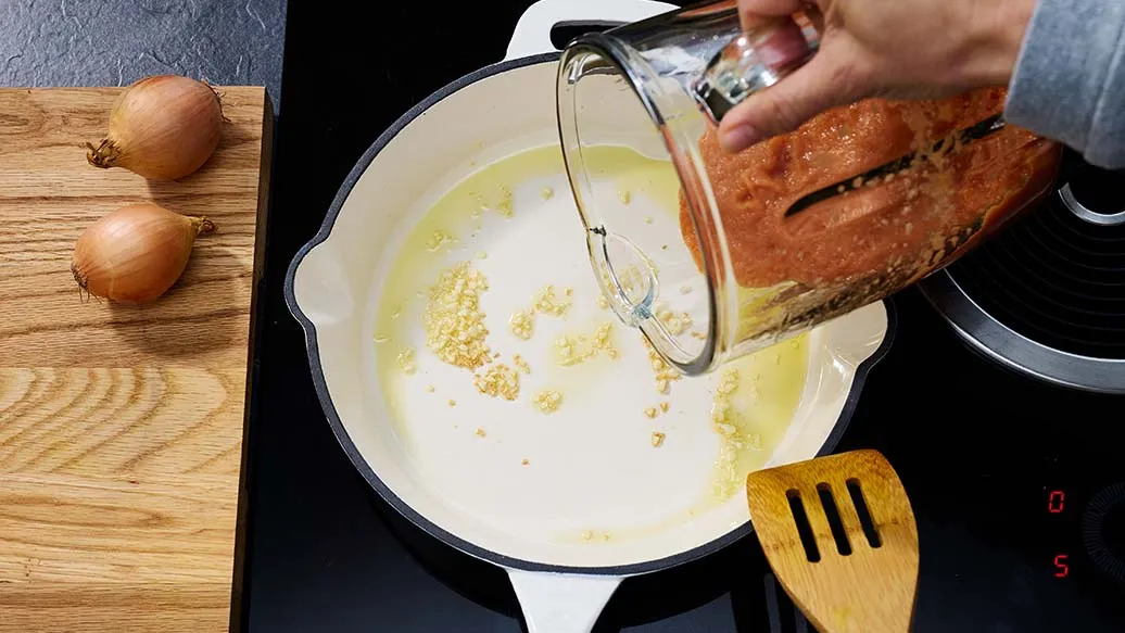 Add the finely chopped garlic and sauté until fragrant. Add the vegetable purée from step 1, cover, and simmer over medium-low heat for about 15 minutes.