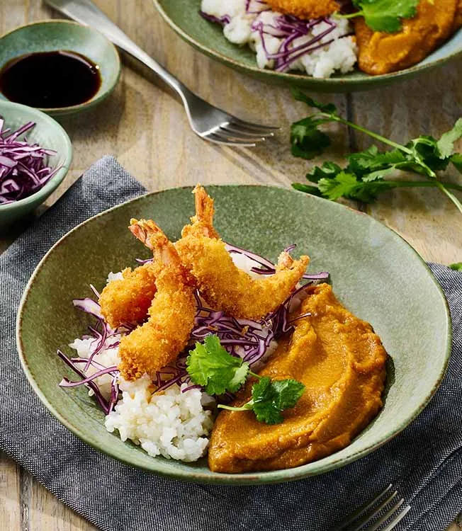 This rich yet simple Japanese curry uses an 'umami bomb' vegetable purée to boost mushroom and tomato flavour. Ramen soup base deepens the umami. Served with crispy king prawns in golden Kikkoman Panko and finely shredded cabbage.