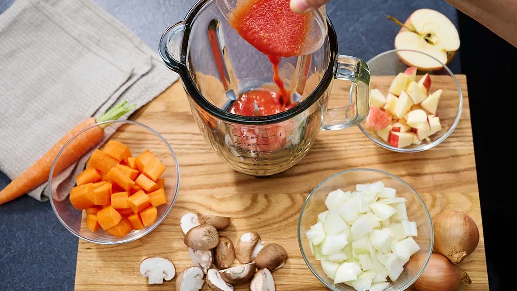 Roughly chop the onion, carrot, mushrooms and apple. Blend with the tinned tomatoes until completely smooth.