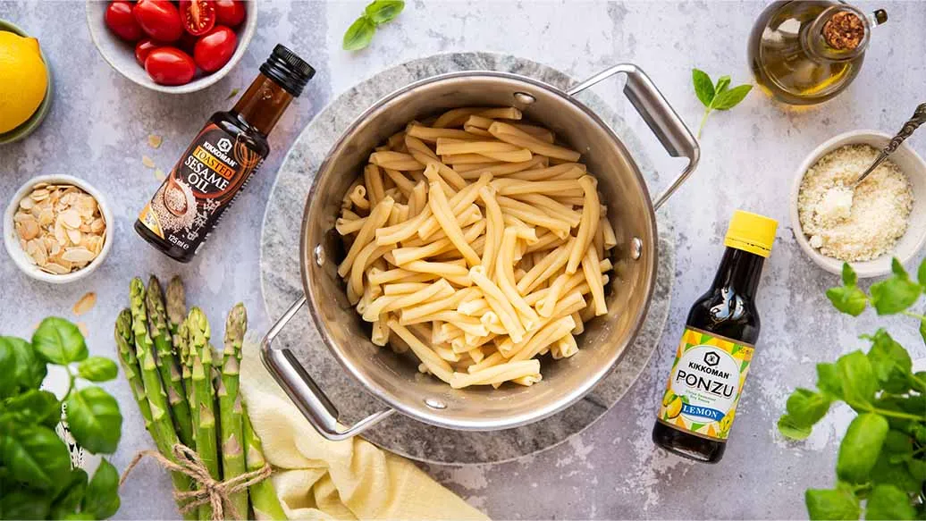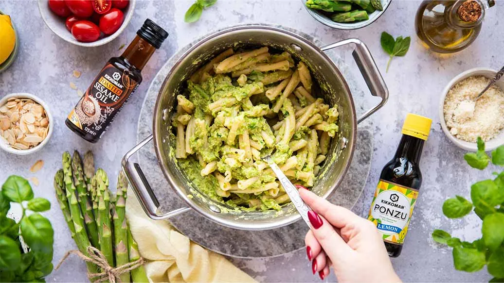 Aromatic spring pasta with green asparagus pesto and Kikkoman Lemon Ponzu is a quick and flavourful dish for any occasion. The addition of Kikkoman Sesame Oil gives the pesto a nutty, roasted depth that goes perfectly with almonds.
