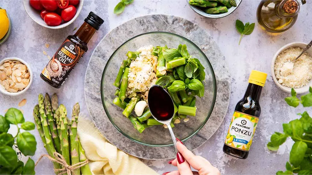 300 g green asparagus – 30 g grated Parmesan – 40 g toasted almond flakes – 1 handful fresh basil leaves – 2 tbsp fresh mint leaves – 1 garlic clove – 3 tbsp olive oil – 2 tsp Kikkoman Toasted Sesame Oil – 2 tbsp Kikkoman Ponzu Citrus Seasoned Soy Sauce - Lemon – ½ tsp freshly ground black pepper