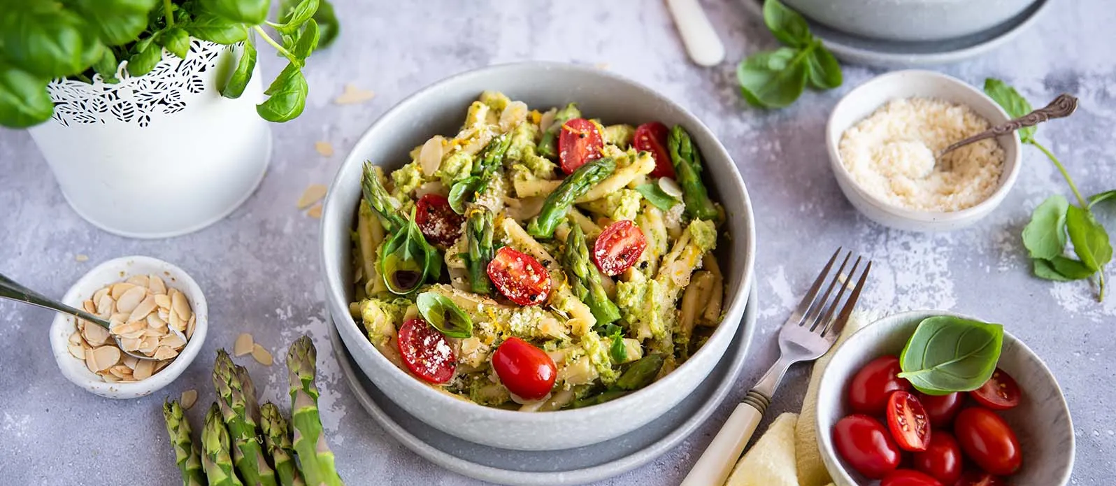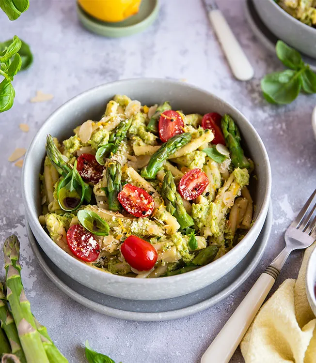 Pasta with asparagus pesto and tomatoes