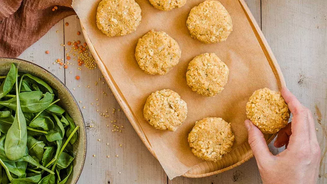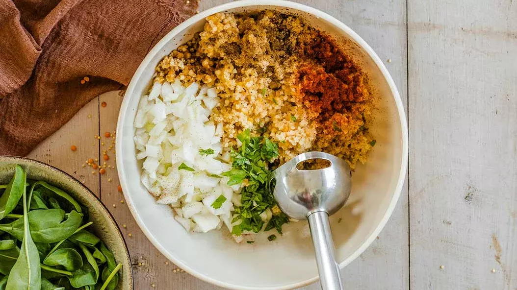 Blend the slightly cooled millet grain and lentils with chopped onion, soy sauce, herbs, and spices. Add panko and mix thoroughly.