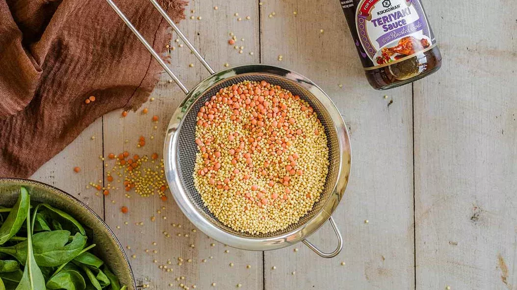 Place millet grain and red lentils together in a sieve, rinse them with cold water, and then with boiling water. Place in a pot with double the volume of water and bring to a boil.